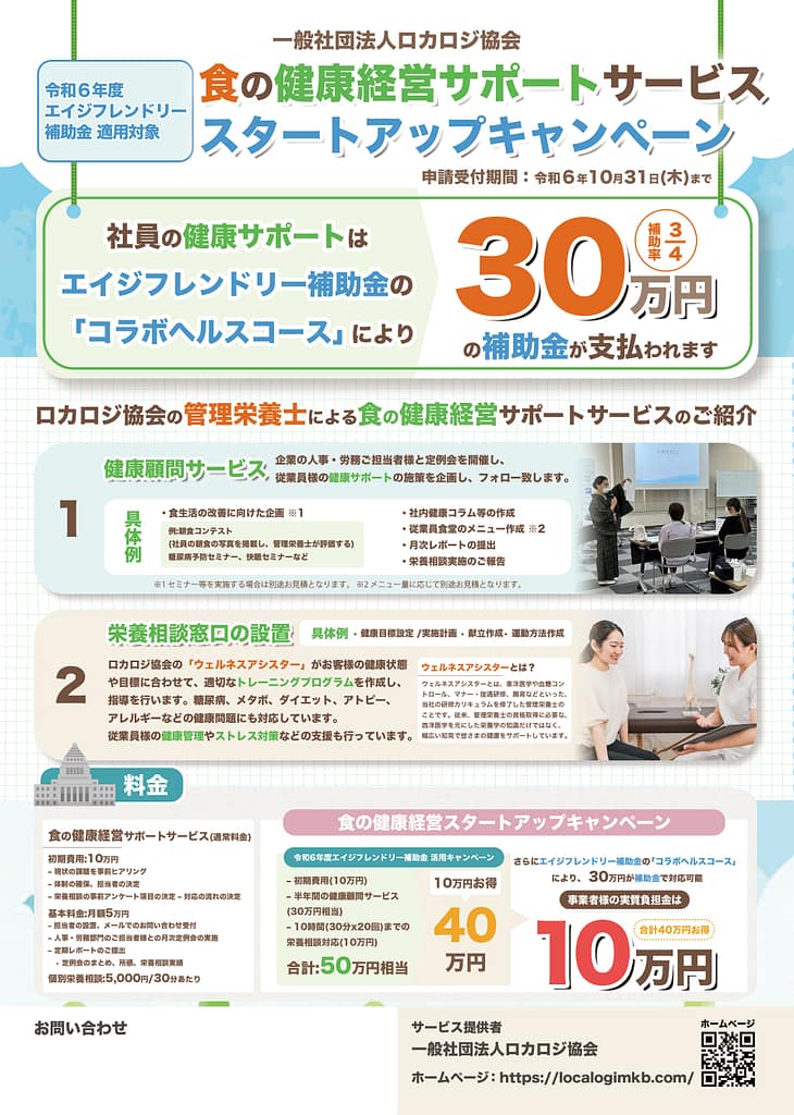 - 従業員の健康増進: 栄養面からのアプローチで、従業員の健康状態を改善し、活力のある職場づくりをサポートします。