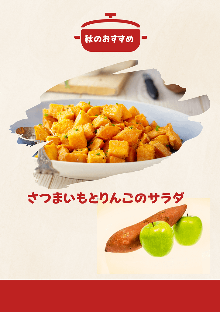- さつまいも、りんご、レーズンをドレッシングで和え、冷蔵庫で冷やして完成。